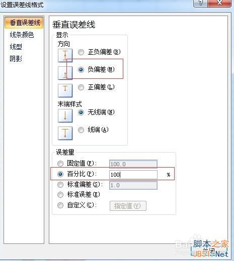 选中“系列1”,布局--误差线--其它误差线选项,显示方向选择负偏差,末端样式选择无线端,误差量选择百分比,填入100。