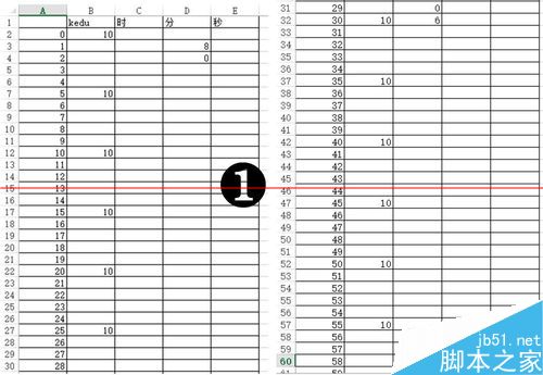 绘制一个表格,如图所示,A列表示时钟转一圈60分钟,每分钟的刻度(0到59);B列表示12个小时的刻度(每5行一个数值);C\D\E分别代表时\分\秒。