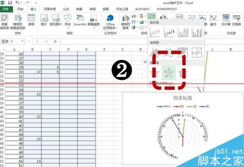 1)选择B、C、D、E单元格数据,插入——带数据标记的雷达图;