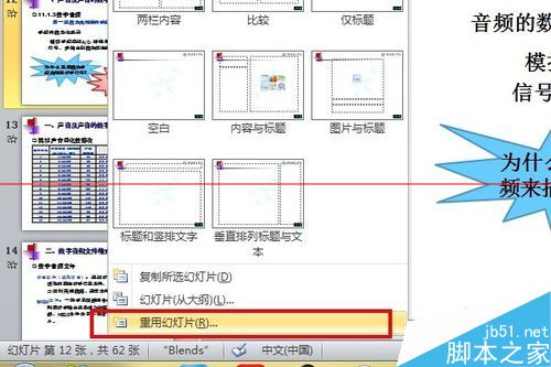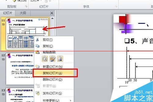 5、重用幻灯片是比较方便快捷的,但是通常我们比较喜欢使用复制的方式,选中要插入的幻灯片,右击复制这张幻灯片