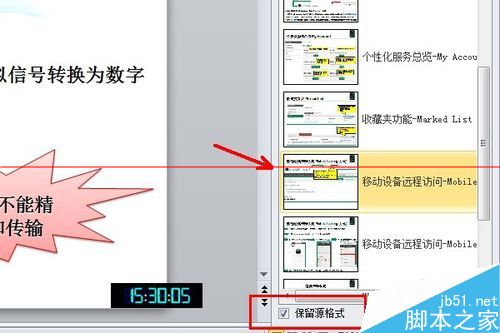 3、找到我们需要插入幻灯片内容的原幻灯片点击打开,右侧窗口出现预览画面,勾选窗口底端的“保留源格式”