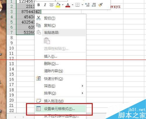 2、用鼠标选中你的输入的几个数据的单元格,然后单击鼠标右键,在弹出来的菜单中,找到“设置单元格格式”选项,然后单击它,会弹出来另一个选项框。