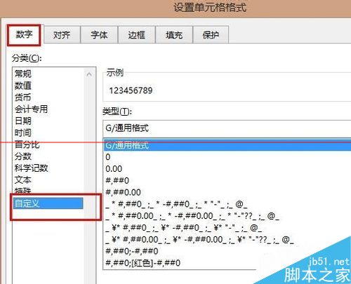 3、在选项框中的最上面的菜单中,选择“数字”,然后在其对应的菜单下,选择“自定义”选项。之后就看到右边的方框选项。