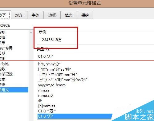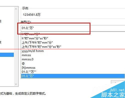 4、在右边的“类型”选项的下面的输入框里,删除原来的文字,然后输入“01.0,万”这几个字和数字就行了,注意引号不用输入哈。