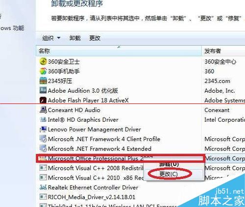 3、选择已安装的2007版本,右击--点击“更改”。