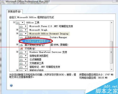 6、单击“microsoft office document imaging”,右击选择“从本机运行全部程序”。