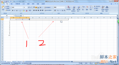 2、在这教大家一个小技巧可以方便快速输入序号(1.2.3.....10),行,列方法都可以用,就是在前面3个序号先手动填写进去,如B1 1 , C1 2 , D1 3,然后选中这三个单元格,出现了一个实心的“+”,你就可能横向拉动到J1,结果你就可 看看,