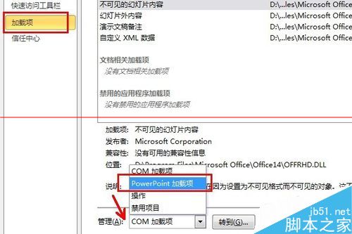 4、在左侧边栏里面点击“加载项”,点击“管理”后面的小框打开列表选择“PowerPoint加载项”然后点击“转到”