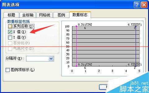 4、在图表中点右键,进入图标选项-选中数据标志中的X值,如图所示