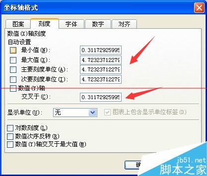 6、设置X坐标轴格式,选择刻度选项卡,最小值及最大值中输入最小及最大筛筛孔尺寸相应的POWER值,主要及次要刻度及交叉点分别输最大筛孔及最小筛孔对应POWER值,如图: