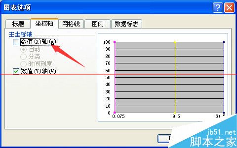 7、打开图表选项,在坐标轴选项卡中,取消数值X轴