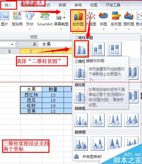 3、添加图表,“插入”→“柱状图”→“二维柱状图”