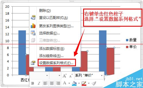 4、生成图表后,“左键单击红色柱子”→再“点击右键”→“设置数据系列格式”