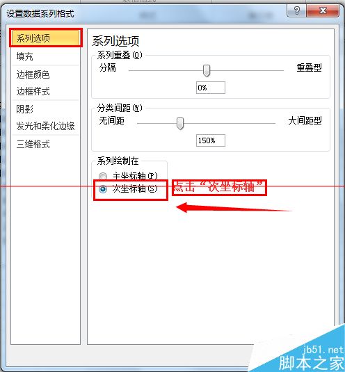 5、在“系列选项”→点击“次坐标轴”→关闭