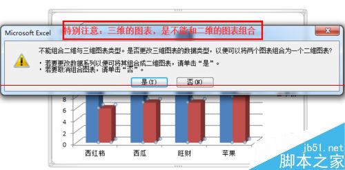 特别注意:三维(3D)的图表,是不能用二维(2D)的图表混合的,就是说三维的柱状图和二维的折线图是不能放在同一张图表上的。