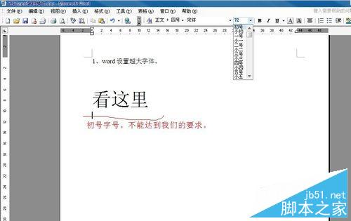 3、点击改变字号的选框,这时我们看字号选项里有最大的初号,点击如下图。