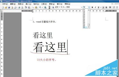 4、下拉字号选框单,看到数字72,点击如下图。
