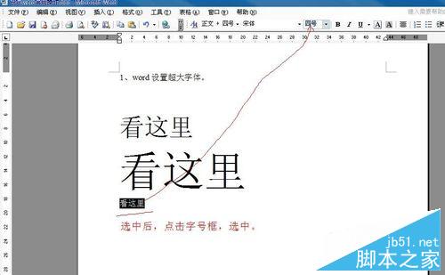 5、如果我们还要比这个更大,我们只要在字号框里输入数字就好了,首先选中我们要改变字号的字,点击字号框里的值,如下图。