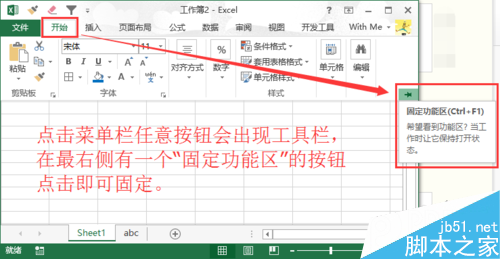 第二步:点击菜单栏任意按钮会出现工具栏,在最右侧有一个“固定功能区”的按钮点击即可固定。
