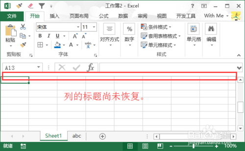 第四步:设置后,工具栏,编辑栏都已经恢复,但是仍旧没有显示标题栏,就是我们常说的A列B列,行1行2等。