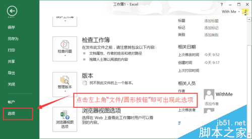 点击Excel左上角的“文件”(较老的版本左上角是个圆形的按钮),点击后,在弹出的菜单中单击“选项”。