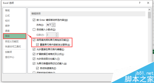 第二步:新弹出页面后,点击“高级”,并在右侧找到“编辑选项”栏目下,勾选“启用填充柄和单元格拖放功能"和“覆盖单元格内容前发出警告”。