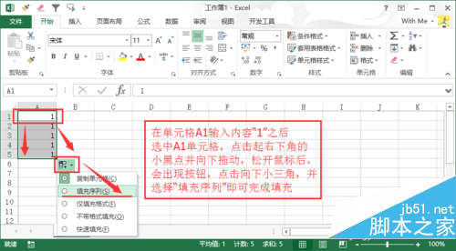 第三步:返回Excel主界面后,在单元格A1输入内容“1”之后,选中A1单元格,点击起右下角的小黑点并向下拖动,松开鼠标后,会出现按钮,点击向下小三角,并选择“填充序列”即可完成填充