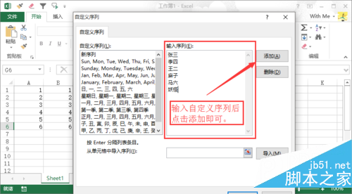 使用步骤1,进入选项,点击“高级”后在其右侧找到“编辑自定义列表”,在弹出新窗口“自定义序列”中,输入自定义内容,完成后点击添加。
