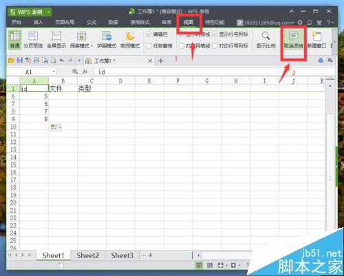 2、点击菜单栏的“视图”按钮,在视图栏工具中点击【取消冻结】。如图所示