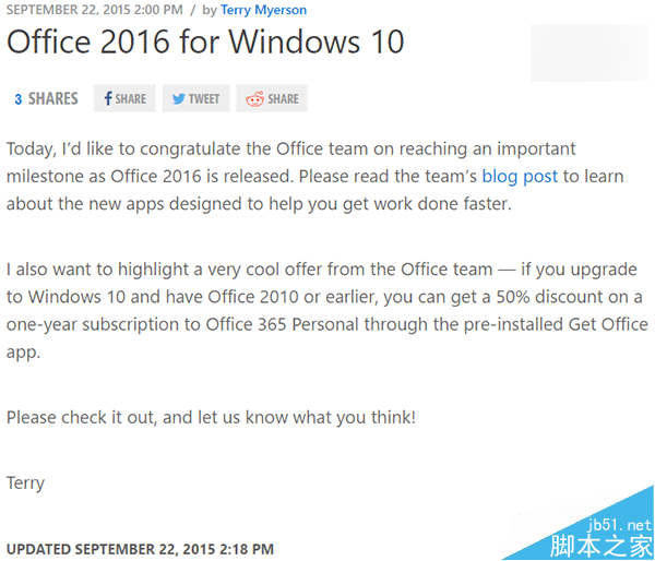 不过微软想让更多的用户加入到Office 2016的阵营。微软执行副总裁Terry Myerson在博客中特意强调了对拥有正版Office 2010及更早版本授权的用户购买Office 365的优惠条件,即:升级到Win10后,使用内置的《获取 Office》应用购买Office 365个人版一年订阅可享受半价优惠。