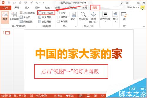 2、先选中任意文字后,在菜单栏中,找到“视图”,并点击“幻灯片母版”。