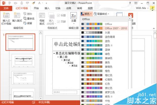4、选择后,在“幻灯片母版”选项卡下,找到“背景”栏目中,点击“颜色”按钮旁边的下拉黑色小三角,在弹出下拉菜单中,选中“Office 2007-2010”,做为当前PPT的主题颜色。