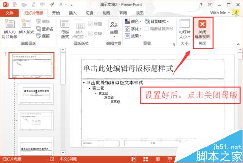 5、设置好了之后,点击“关闭母版视图”即可退出幻灯片母版界面。备注:不少朋友设置,不知道怎么退出幻灯片母版,特此强调!