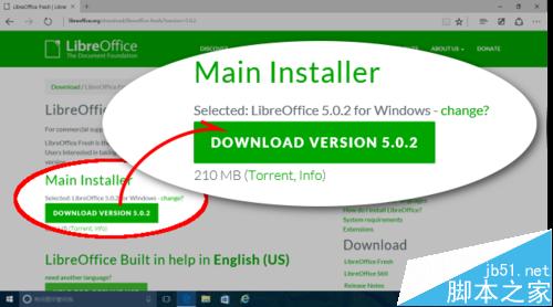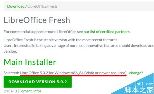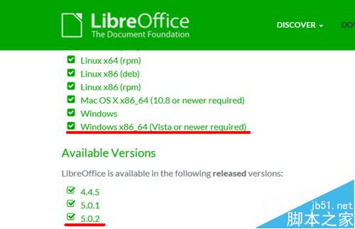 6、比如,我们的电脑安装了 64 位的 Win10,而且我们想下载最新版的 LibreOffice,我们就可以点选图中下划红线的选项,即 Windows x86_64(Vista or newer required,和 5.02。