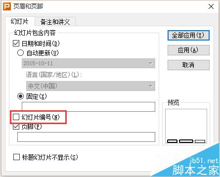 4、勾选幻灯片编号选项,然后点击右上方的【全部应用】按钮,点击全部应用按钮可以给该PPT内所有的幻灯片添加页码,如果点击【应用】按钮,只会给选定的幻灯片添加页码,这点需要大家注意一下。