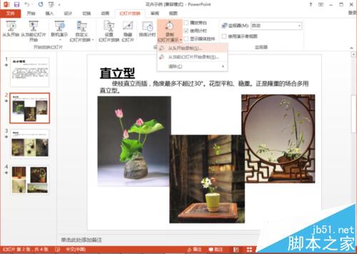 2、打开需要录制旁白的PPT文件,示例中为《花卉示例》。选择幻灯片放映选项卡>录制幻灯片演示。支持“从头开始录制”和“从当前页面开始录制”,建议单张页面录制,选择从当前幻灯片开始录制。