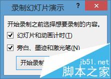 3、随后出现录制幻灯片演示对话框,选择录制时的一些设置,默认勾选了幻灯片动画和计时与旁白和激光笔的。完成设置后,点击开始录制。