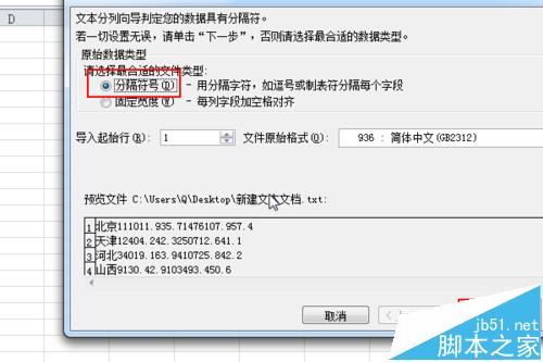 3、这时会出现导入过程的对话框,首先选择分割符号,excel通过对txt里面的符号识别划分字段
