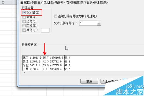 4、接下来这一步我们选择Tab键,注意下方的字段划分情况,只有选择对了划分的标准我们才能将这些字段成功导入,如果有些字段不容易分开,我们可以先保留,等数据进入表格以后,再处理