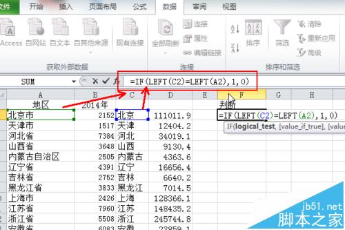 6、导入数据以后我们发现第一列和第三列的地区名重复了,但是无法确定数据是否左右一一对应,在F2单元格输入=IF(LEFT(A2)=LEFT(C2),1,0)如果左右对应的话,返回1,否则显示0