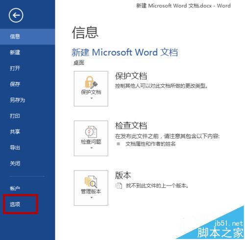 2、新开一个文档,左键点击左上角的“文件”,进入下面的页面,点击最下面的“选项”,进入“Word 选项”