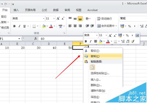 2、右键excel里面F1,选择复制