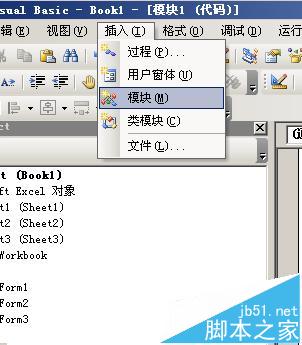 3、进入到VB编辑器以后,在VB编辑器的菜单选项中的插入菜单下,选择插入模块。