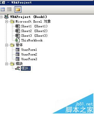 4、插入之后,在我们的工程窗体中就会出现一个模块选项,用鼠标双击一下,就会在右边的窗口中出现一个代码编辑区。