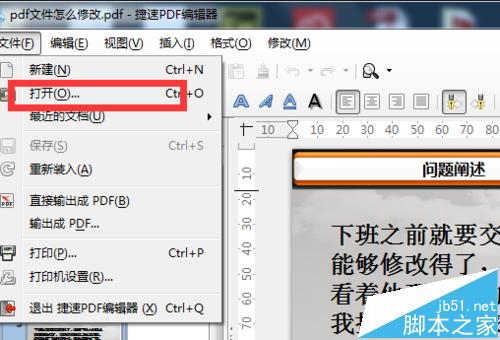 1、打开编辑软件,点击“文件”中的“打开”就会弹出对话框,到保存PDF文件的文件夹把需要编辑的文件打开。