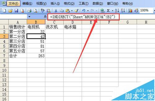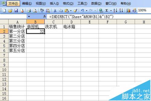 4、调用函数进行汇总。单击B2单元格,输入公式=INDIRECT("Sheet"&ROW(B1)&"!B2"),这个函数里嵌套一个行号函数ROW,"Sheet"&ROW(B1)相当于Sheet1,,括号内的字符串表示引用第一张工作表的B2单元格数据。输入好公式后按回车键确定。这时显示数据32。注意ROW(B1)=1。
