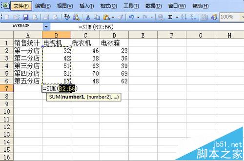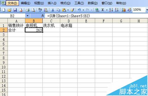 11、对不同工作表数据求和。有时候我们不需要汇总表格所有数据,只需要了解某一电气的总销售量,怎么办呢?如图,单击B2单元格,输入公式=SUM(Sheet1:Sheet5!B2),意思是对第一张到第五张表格的B2单元格数据求和。按回车键。