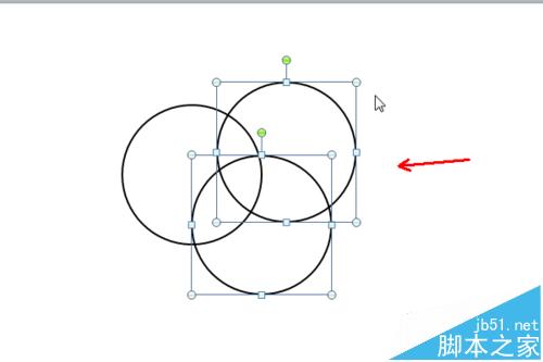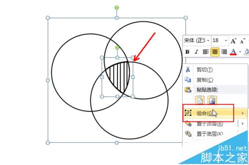 7、将直线和交叉图形的组合移动到三个正圆的组合中间,如图所示,选中所有的图形,右击选择“组合”