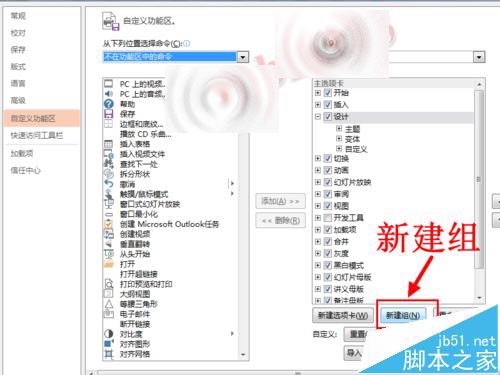 5、不在功能区中的命令列表里,就有拆分形状命令,但是不能直接添加到功能区中。现在在右边的主选项卡列表里选择一个选项卡,然后点击下方的“新建组”。