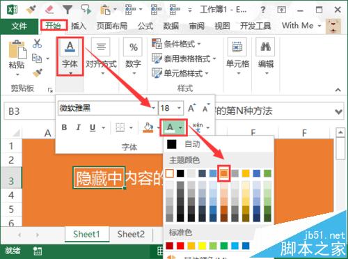 选中要隐藏的内容所在的单元格,在Excel顶部的菜单栏中,点击“开始”选项卡,在“字体”栏目下,点击“字体颜色(A)”旁边的黑色下拉小三角,再弹出的颜色区块中,选择为橙色。这样字体则和背景色融为一体,达到显示效果的上的隐藏。